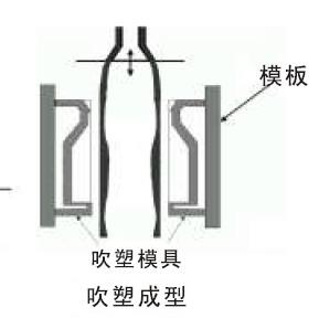 將(jiāng)達到要求長(cháng)度的型坯置于吹塑模具内合模,由模具上的刃口將(jiāng)型坯切斷,通過(guò)模具上的進(jìn)氣口輸入一定壓力的氣體吹脹型坯,使制品和模具内表面(miàn)緊密接觸。