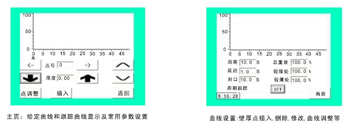 溫度控制由熱電偶、電加熱及電風扇組成(chéng)。PID運算由模塊完成(chéng),有模拟量和數字量輸出,單雙向(xiàng)控制方式選擇,控制精度達到±1℃。壁厚控制由電液伺服閥、動作執行機構和位置反饋的電子尺構成(chéng)。壁厚型坯設定采用數字化方式,通過(guò)操作面(miàn)闆完成(chéng)50點型坯壁厚控制的設定,型坯壁厚曲線的縱坐标顯示壁厚,橫坐标顯示點數。