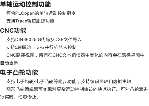 CoMotion平台的CTH300-C系列運動控制器采用基于PLCopen架構的運動控制平台,支持電子凸輪、電子齒輪、相位同步、點到點定位等産業設備所需要的複雜運動功能(néng)函數;同時CTH300-C系列運動控制器具備數控機床控制功能(néng),根據不同的機床結構,應用不同的軌迹規劃函數,即可架構出機床應用的核心系統,這(zhè)包括五軸聯動機床、并行機械手、關節型機械手、極坐标機械手等,并能(néng)夠執行相應的G代碼程序。