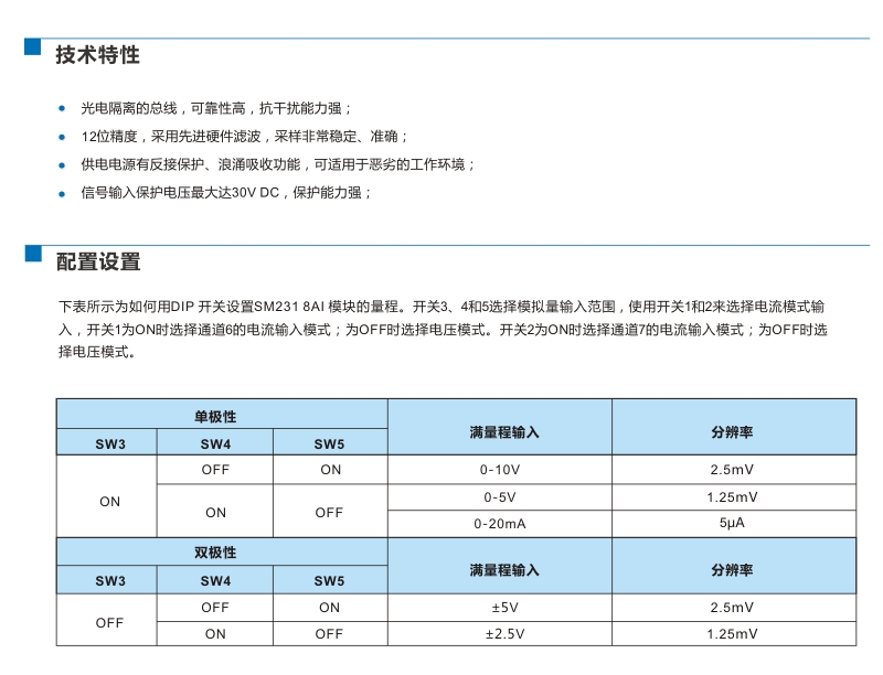 模拟量輸入模塊,4點,0~20 mA電流或±5V,±2.5V,0~10V,0~5V電壓輸入,隔離型12位精度/模拟量電壓輸入模塊,8 點,±2.5V,0~10V,0~5V電壓輸入且兩(liǎng)通道(dào)可選0~20mA電流輸入,隔離型12位精度