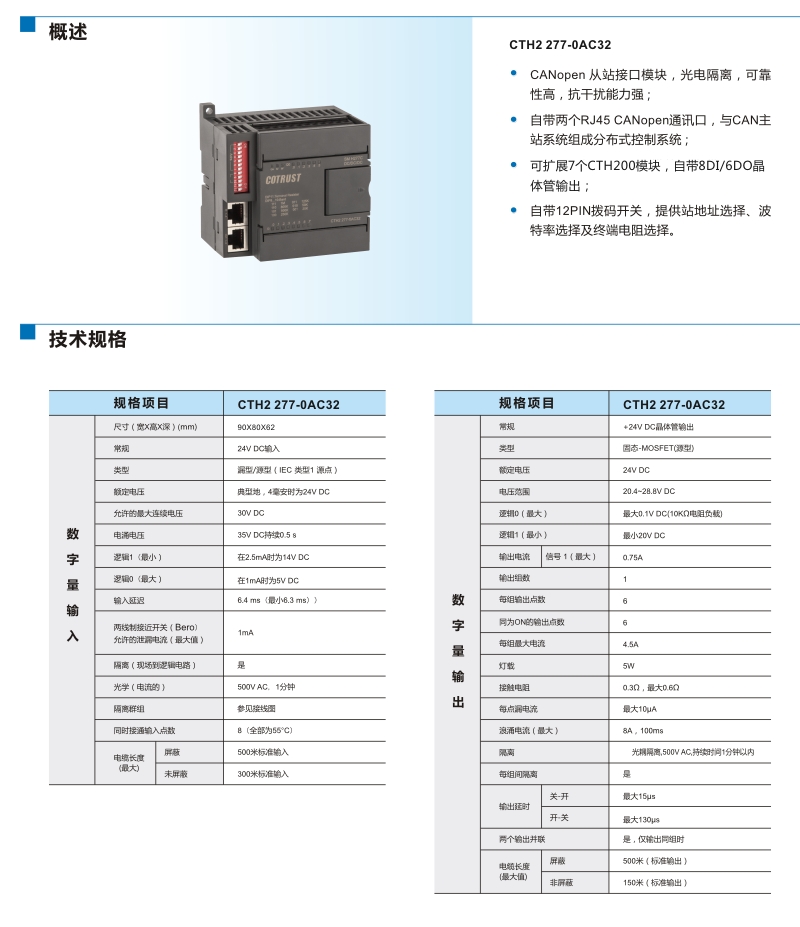 規 格:CAN從站模塊,自帶8DI/6DO,光電隔離